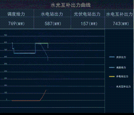如上圖,當光照較強時,水電機組降功率運行,充分利用太陽能資源;當陰雨天、夜晚光照下降時,水電機組又及時補充,減少天氣變化對電網(wǎng)的影響,提高電能質(zhì)量,將原本光伏間歇、波動、隨機的功率不穩(wěn)定的鋸齒型光伏電源,調(diào)整為均衡、優(yōu)質(zhì)、安全,更加友好的平滑穩(wěn)定電源,以兩個電源組合的電量,利用龍羊峽水電站的送出通道送入電網(wǎng)。