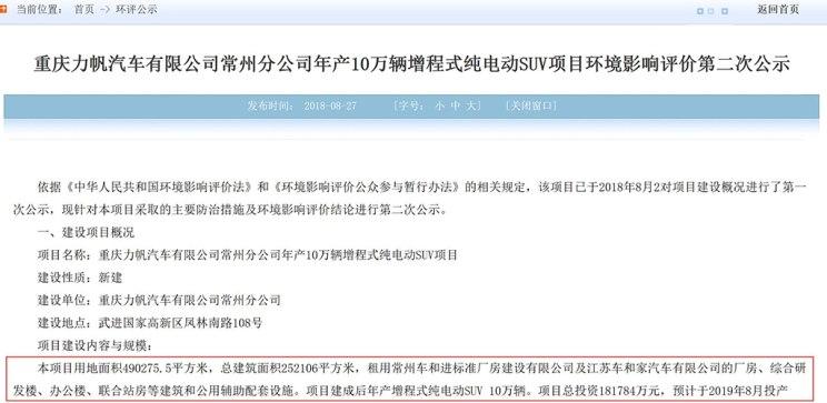 力帆汽車計劃通過租賃車和家江蘇常州工廠,建設一個年產(chǎn)10萬輛的增程式純電動SUV項目。近日,江蘇環(huán)保公眾網(wǎng)發(fā)布了環(huán)評公示,公示顯示,該項目總投資超18億元,預計于2019年8月投產(chǎn)。