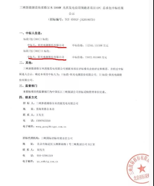 此前,8月16日,三峽新能源對“青海省格爾木500MW光伏發(fā)電應(yīng)用領(lǐng)跑者項目EPC總承包中標候選人”進行了公示,陽光電源、中國電建西勘院、中國電建山西院分別入選。8月31日,三峽新能源公布陽光電源成為此次500MW項目的EPC總包方。