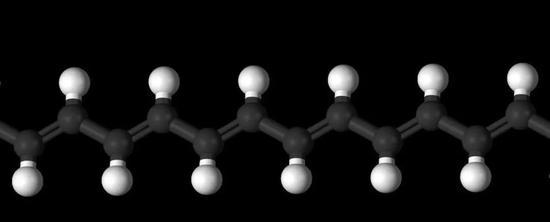 聚乙炔的化學(xué)結(jié)構(gòu)式(上)和球棍模型圖(下)。圖片來(lái)源:wikipedia