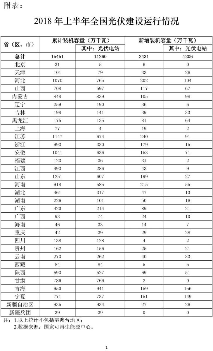 截至2018年6月底,全國光伏發(fā)電裝機(jī)容量達(dá)到15451萬千瓦,其中,光伏電站11260萬千瓦,分布式光伏4190.3萬千瓦。上半年光伏發(fā)電量823.9億千瓦時(shí),同比增長59%;棄光率3.6%,同比下降3.2個(gè)百分點(diǎn)。棄光主要集中在新疆和甘肅,其中,新疆(不含兵團(tuán))棄光電量13.5億千瓦時(shí),棄光率20%,同比下降6.1個(gè)百分點(diǎn);甘肅棄光電量5.9億千瓦時(shí),棄光率11%,同比下降11個(gè)百分點(diǎn)。