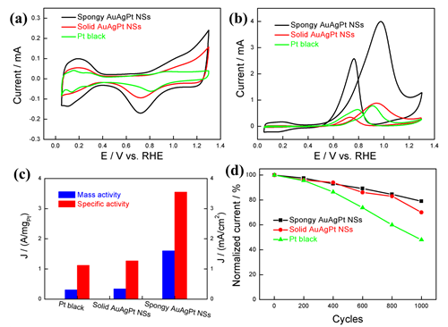 圖3. AuAgPt三元合金納米球、實(shí)心AuAgPt合金納米球和鉑黑甲醇電催化性能測(cè)試。(a) 在氮?dú)怙柡偷?.1 M HClO4 溶液中測(cè)試得到的循環(huán)伏安圖;(b) 在0.1 M HClO4 + 0.2 M甲醇溶液中測(cè)試得到的甲醇氧化曲線;(c) 不同催化劑的甲醇氧化活性對(duì)比柱狀圖;(d) 穩(wěn)定性測(cè)試對(duì)比圖。