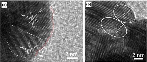 圖2. AuAgPt三元合金納米球的HRTEM圖。(a) 顆粒中存在的孿晶界和高指數(shù)晶面;(b) 晶格畸變的局部放大圖。
