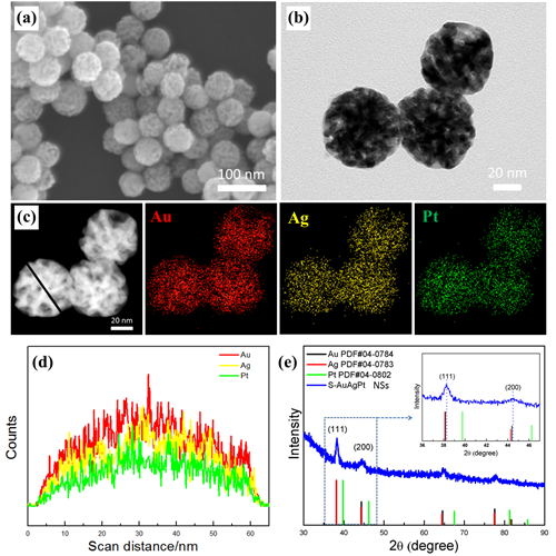 圖1. (a)-(b) 分別為AuAgPt三元合金納米球的場(chǎng)發(fā)射掃描電子顯微鏡和透射電鏡圖;(c) AuAgPt三元合金納米球的高角環(huán)形暗場(chǎng)-掃描投射圖片和元素分布圖;(d)線掃元素分布圖;(e)AuAgPt三元合金納米球的X射線衍射圖譜。