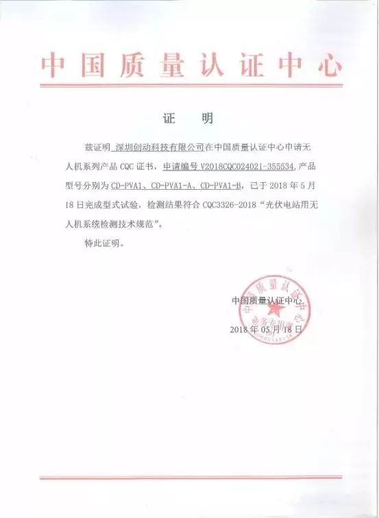 在中國質(zhì)量認(rèn)證中心的牽頭下,創(chuàng)動科技參與了《光伏電站用無人機(jī)系統(tǒng)檢測技術(shù)規(guī)范》的編寫。5月18日創(chuàng)動智能光伏運(yùn)維無人機(jī)通過了產(chǎn)品型式試驗(yàn)及工廠審查等多個認(rèn)證規(guī)則的要求,于6月15日獲得中國質(zhì)量認(rèn)證中心CQC光伏電站用無人機(jī)認(rèn)證證書,這也是全國首家獲得該證書的無人機(jī)生產(chǎn)企業(yè)。