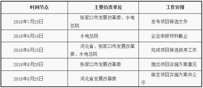 2018年7月20日前,公開項(xiàng)目篩選工作方案;7月25日前,張家口市發(fā)展改革委、水電水利規(guī)劃設(shè)計(jì)總院發(fā)布項(xiàng)目篩選文件; 8月10日企業(yè)申報(bào)材料提交截止;8月15日前,完成項(xiàng)目篩選排序工作;8月20日前,張家口市發(fā)展改革委提出項(xiàng)目實(shí)施方案意見,并報(bào)送請示文件;8月25日前,河北省發(fā)展改革委審定項(xiàng)目實(shí)施方案,并在省發(fā)改委網(wǎng)站公示,公示時間為5天;8月31日前,下達(dá)張家口市示范區(qū)項(xiàng)目實(shí)施方案。