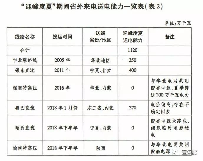 2.省外來(lái)電情況。截至2017年底,我省已建成并正常送電的有錫盟特高壓、銀東直流、華北聯(lián)絡(luò)線等3條“ 外電入魯 ” 輸電線路,最大送電能力950萬(wàn)千瓦。2018年擬投產(chǎn)的“ 兩直一交 ”條特高壓線路中,昭沂直流受聯(lián)絡(luò)線緩建影響投產(chǎn)送電時(shí)間不確定,榆橫特高壓配套電源度夏前僅能投產(chǎn)一臺(tái)100萬(wàn)千瓦機(jī)組,但因華北電網(wǎng)和我省分電比例未明確不能落實(shí)送入電力,迎峰度夏前預(yù)計(jì)僅魯田直流具備增送370萬(wàn)千瓦能力。 考慮錫盟特高壓配套電源未投產(chǎn)、華北電網(wǎng)臨時(shí)組織的200萬(wàn)千瓦富余電力夏季可能停送等因素,迎峰度夏期間“ 外電入魯” 最大送入能力為1120萬(wàn)千瓦。(詳見(jiàn)表2)