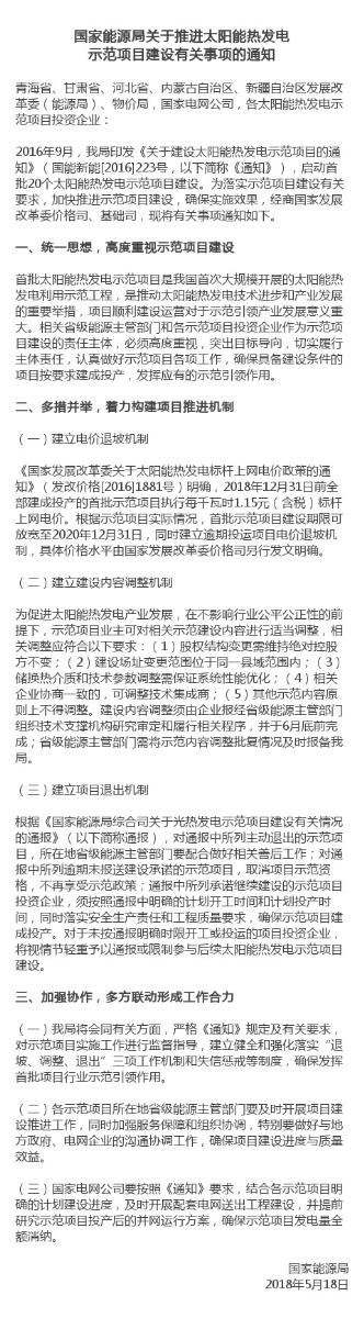 中國(guó)儲(chǔ)能網(wǎng)訊:國(guó)家能源局關(guān)于推進(jìn)太陽能熱發(fā)電示范項(xiàng)目建設(shè)有關(guān)事項(xiàng)的通知