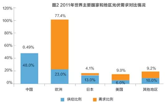 2012年左右,中國光伏產(chǎn)業(yè)仍處于發(fā)展起步階段。在設(shè)備制造方面,太陽能電池生產(chǎn)的關(guān)鍵設(shè)備大多來自國外供應(yīng)商,僅此項(xiàng)成本便占據(jù)企業(yè)總成本的80%;在晶硅提煉方面,國內(nèi)晶硅板制造企業(yè)普遍缺乏最核心的晶硅提煉技術(shù),硅錠主要依賴美國進(jìn)口,國內(nèi)企業(yè)僅扮演來料加工的角色,附加值極低;在市場開發(fā)方面,中國光伏企業(yè)嚴(yán)重依賴出口,2011年,我國太陽能電池供給比例高達(dá)48%,而國內(nèi)對太陽能電池需求占比僅為0.4% (見圖2)。普遍缺乏核心技術(shù)、嚴(yán)重依賴國外市場、“兩頭在外、受制于外”的畸形發(fā)展模式,嚴(yán)重掣肘中國光伏產(chǎn)業(yè)的持續(xù)發(fā)展。海外市場的變化,更是成為了中國光伏企業(yè)的命門所在。