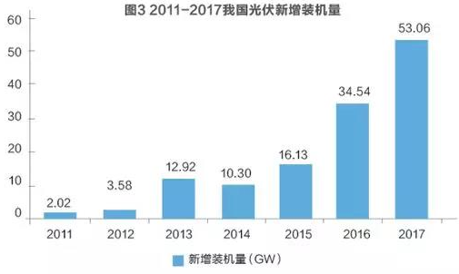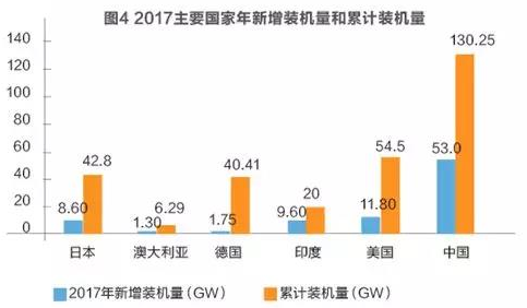 在政策指引下,國內(nèi)光伏裝機(jī)總量逐年攀升(圖3),2017年我國光伏累計裝機(jī)量已經(jīng)達(dá)到130.25GW,新增裝機(jī)量達(dá)到53.06GW,占全球新增裝機(jī)量的54%左右,均處于世界領(lǐng)先地位(圖4)。