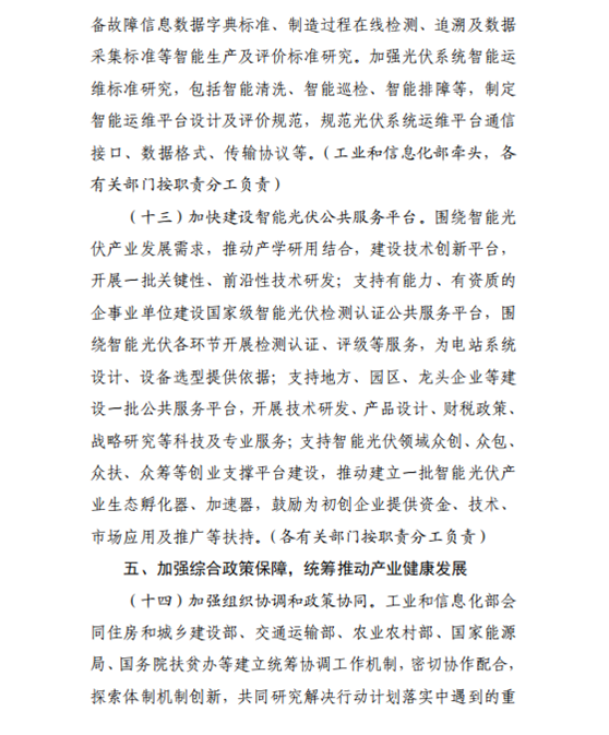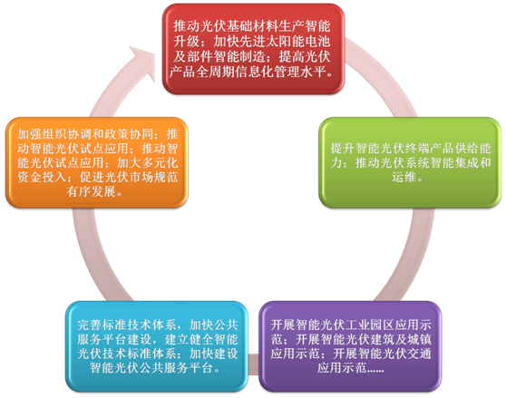 一是加快產(chǎn)業(yè)技術(shù)創(chuàng)新,提升智能制造水平。二是推動兩化深度融合,發(fā)展智能光伏集成運(yùn)維。三是促進(jìn)特色行業(yè)應(yīng)用示范,積極推動綠色發(fā)展。四是完善標(biāo)準(zhǔn)技術(shù)體系,加快公共服務(wù)平臺建設(shè),建立健全智能光伏技術(shù)標(biāo)準(zhǔn)體系;加快建設(shè)智能光伏公共服務(wù)平臺。五是加強(qiáng)綜合政策保障,統(tǒng)籌推動產(chǎn)業(yè)健康發(fā)展。具體內(nèi)容,如下圖所示。