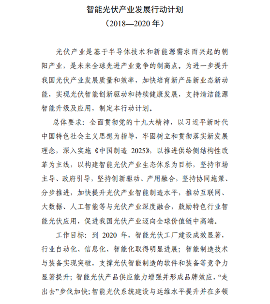 中國儲能網(wǎng)訊:近日,工業(yè)和信息化部、住房和城鄉(xiāng)建設(shè)部、交通運(yùn)輸部、農(nóng)業(yè)農(nóng)村部、國家能源局、國務(wù)院扶貧辦聯(lián)合印發(fā)《智能光伏產(chǎn)業(yè)發(fā)展行動計(jì)劃(2018-2020年)》的通知。加上此前不久發(fā)布的《關(guān)于完善光伏發(fā)電建設(shè)規(guī)模管理的意見》和《分布式光伏發(fā)電項(xiàng)目管理辦法》,政策對光伏這一朝陽產(chǎn)業(yè)的重視可見一斑。