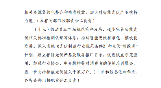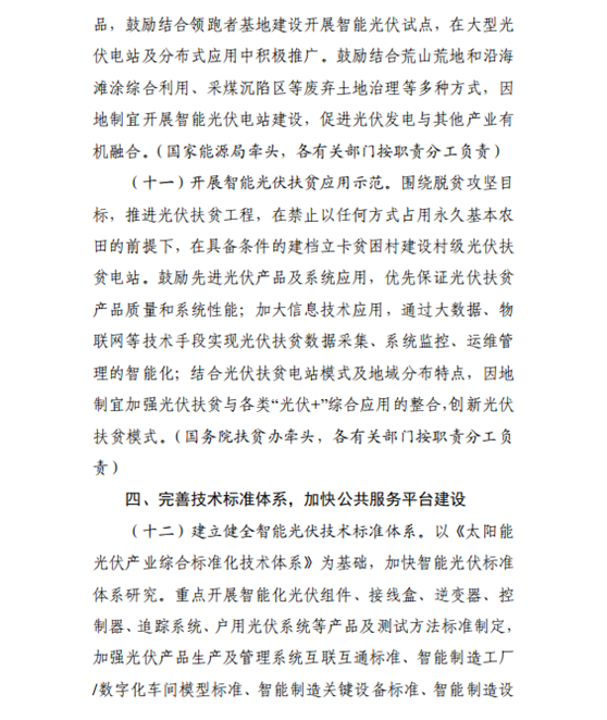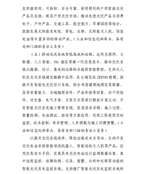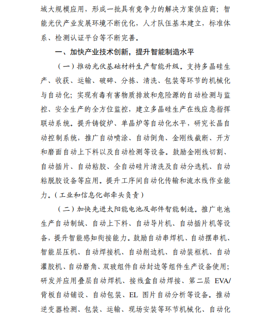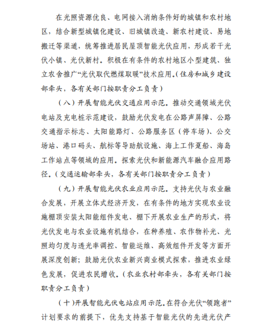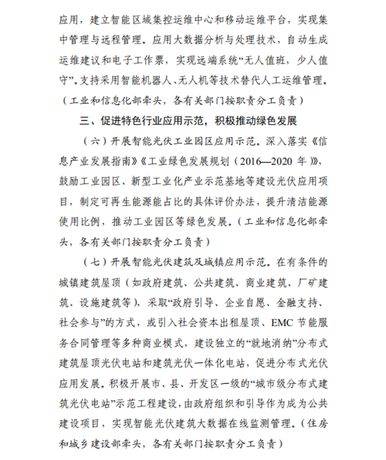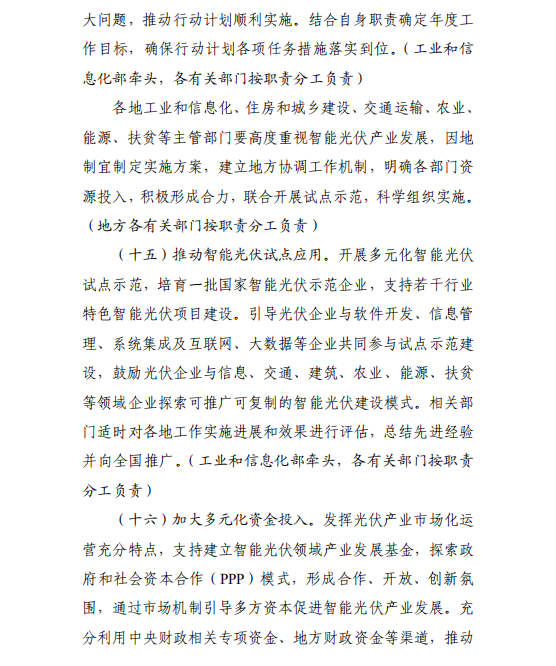 此次《行動計(jì)劃》提綱挈領(lǐng)地將光伏產(chǎn)業(yè)定義為基于半導(dǎo)體技術(shù)和新能源需求而興起的朝陽產(chǎn)業(yè)。在《行動計(jì)劃》中囊括了智能光伏從光伏基材生產(chǎn)制造、系統(tǒng)搭建與運(yùn)營維護(hù)等產(chǎn)業(yè)鏈各細(xì)分部分。此外,還延伸了其智能應(yīng)用示范領(lǐng)域,其中不僅有工業(yè)園區(qū),還包括了建筑與城鎮(zhèn)、交通、農(nóng)業(yè)等。