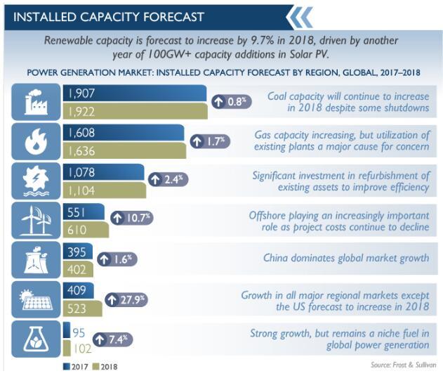 與2017年類似,F(xiàn)rost&Sullivan預(yù)計(jì)太陽能占投資的大部分,預(yù)計(jì)2018年為1230.3億美元,中國將成為主要投資方。太陽能和風(fēng)能(海上)的需求和投資環(huán)境呈現(xiàn)出積極的態(tài)勢。