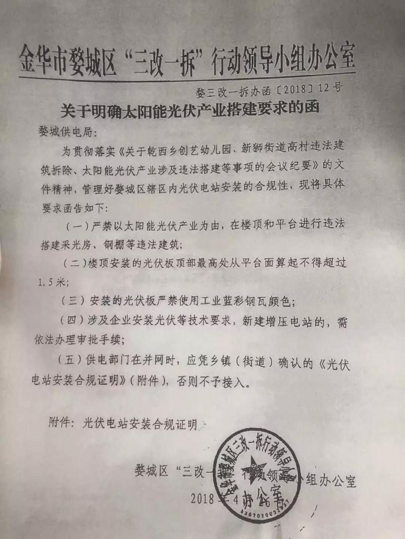 中國儲能網(wǎng)訊:近日,金華市婺城區(qū)“三改一拆”行動領導小組辦公室發(fā)布了《關于明確太陽能光伏產(chǎn)業(yè)搭建要求的函》,對當?shù)毓夥娬窘ㄔO提出以下要求: