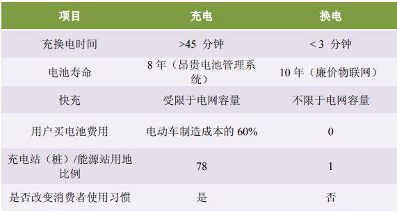 本項(xiàng)目所建設(shè)能源站擬采取自主研發(fā)的“動(dòng)力電池更換”為主兼顧充電的模式。相較于充電模式,在更換時(shí)間、電池壽命、征地占地、投資回收期等方面,換電模式都體現(xiàn)出較為顯著的競爭優(yōu)勢(見下圖)。