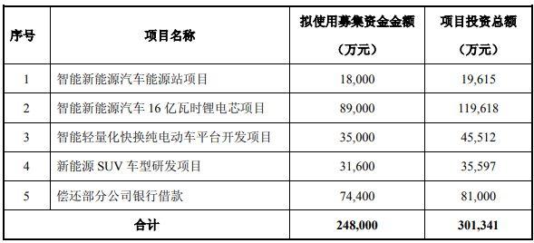 中國儲能網(wǎng)訊:力帆股份5月6日晚間發(fā)布非公開發(fā)行A股股票預(yù)案,擬募集資金總額不超過24.8億元,用于投資智能新能源汽車能源站、智能新能源汽車16億瓦時(shí)鋰電芯、智能輕量化快換純電動(dòng)車平臺開發(fā)等項(xiàng)目,以及償還銀行借款(見下表)。