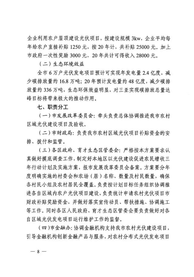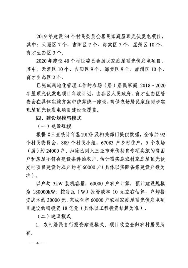 為進(jìn)一步優(yōu)化我市能源利用結(jié)構(gòu),大力發(fā)展清潔能源,推動(dòng)我市農(nóng)村家庭屋頂光伏發(fā)電項(xiàng)目建設(shè),促進(jìn)農(nóng)民增收,我市正式印發(fā)了《三亞市推進(jìn)農(nóng)村家庭屋頂光伏項(xiàng)目建設(shè)實(shí)施方案》,力爭(zhēng)到2020年,實(shí)現(xiàn)92個(gè)村民委員會(huì)及已完成屬地化管理的農(nóng)場(chǎng)(居)符合建設(shè)條件的居民家庭屋頂光伏發(fā)電項(xiàng)目建設(shè)全覆蓋。