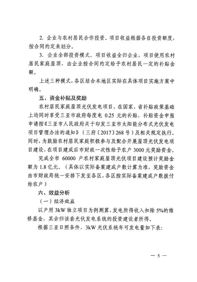方案中提到,我市的農(nóng)村居民家庭屋頂光伏發(fā)電項(xiàng)目,在享受?chē)?guó)家補(bǔ)貼政策基礎(chǔ)上均同時(shí)享受三亞市政府每度電0.25元的補(bǔ)貼,補(bǔ)貼資金申報(bào)申請(qǐng)按《三亞市人民政府關(guān)于印發(fā)三亞市太陽(yáng)能分布式光伏發(fā)電項(xiàng)目管理辦法的通知》及相關(guān)規(guī)定執(zhí)行。根據(jù)《三亞市太陽(yáng)能分布式光伏發(fā)電項(xiàng)目管理辦法》的規(guī)定,我市分布式光伏發(fā)電項(xiàng)目的補(bǔ)貼采取后補(bǔ)助方式,在分布式光伏發(fā)電項(xiàng)目驗(yàn)收合格并投產(chǎn)滿(mǎn)1年后開(kāi)始補(bǔ)助,補(bǔ)助時(shí)間為2020年前在三亞市行政轄區(qū)內(nèi)建成的符合條件的分布式光伏發(fā)電項(xiàng)目,且在項(xiàng)目建成投產(chǎn)后連續(xù)5年可享受相關(guān)財(cái)政補(bǔ)貼。