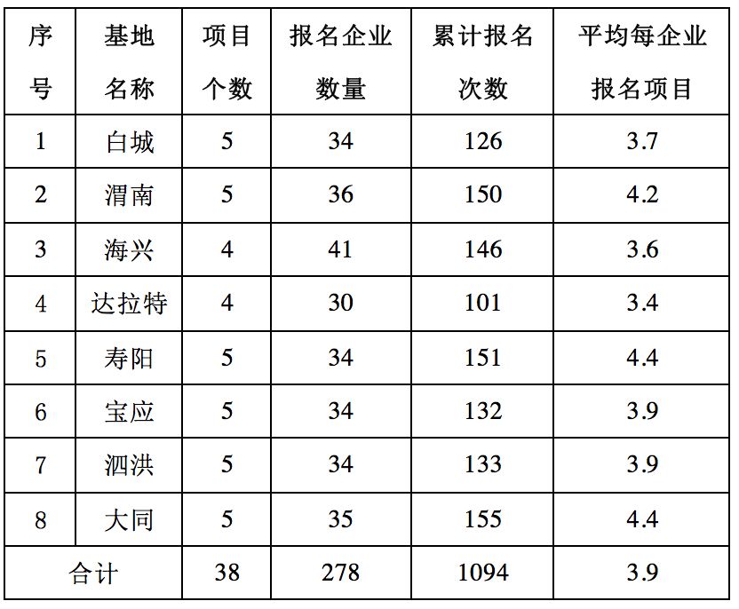 由于每個(gè)企業(yè)可以報(bào)名一個(gè)基地多個(gè)項(xiàng)目,其中,壽陽、大同項(xiàng)目每個(gè)企業(yè)平均報(bào)名4.4個(gè)項(xiàng)目,因此,應(yīng)該有很多企業(yè)報(bào)名了全部的5個(gè)項(xiàng)目;達(dá)拉特平均每個(gè)企業(yè)報(bào)名3.4個(gè)項(xiàng)目。