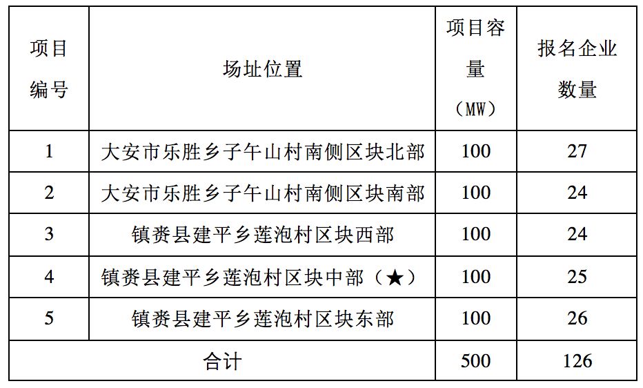 根據(jù)《白城光伏發(fā)電應(yīng)用領(lǐng)跑基地2017年競爭優(yōu)選公告》,截止至2018年2月7日17時(shí),共接收34家企業(yè)報(bào)名,各項(xiàng)目報(bào)名企業(yè)數(shù)量見下表。