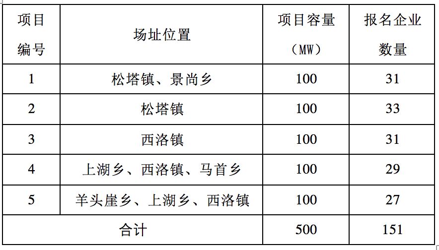 根據(jù)《渭南光伏發(fā)電應(yīng)用領(lǐng)跑基地2017年競爭優(yōu)選公告》,截止至2018年2月15日,共接收36家企業(yè)報(bào)名,各項(xiàng)目報(bào)名企業(yè)數(shù)量見下表。