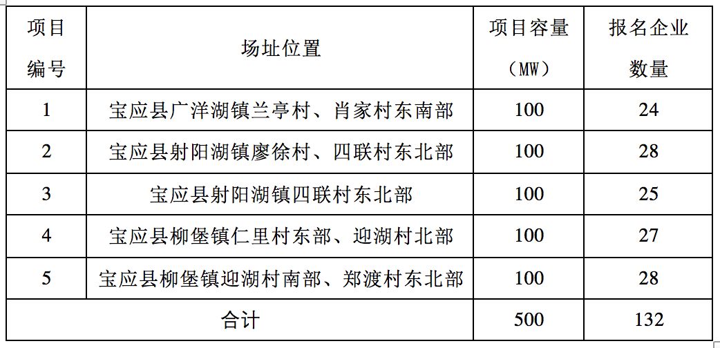 根據(jù)《寶應(yīng)光伏發(fā)電應(yīng)用領(lǐng)跑基地2017年競爭優(yōu)選公告》,截止至2018年2月16日,共接收34家企業(yè)報(bào)名,各項(xiàng)目報(bào)名企業(yè)數(shù)量見下表。