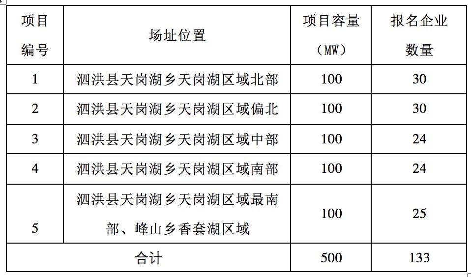 根據(jù)《泗洪光伏發(fā)電應(yīng)用領(lǐng)跑基地2017年競爭優(yōu)選公告》,截止至2018年2月16日,共接收34家企業(yè)報(bào)名,各項(xiàng)目報(bào)名企業(yè)數(shù)量見下表。