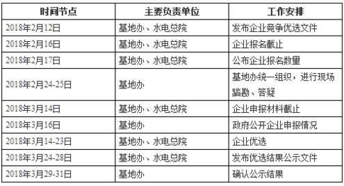 根據(jù)優(yōu)選工作初步安排,2018年2月7日編制完成優(yōu)選工作方案;2018年2月11日省發(fā)改委批復(fù)優(yōu)選工作方案;2018年2月12日公開優(yōu)選工作方案(簡版);2018年2月12日基地政府審定競爭優(yōu)選文件;2018年2月12日發(fā)布企業(yè)競爭優(yōu)選文件;2018年2月12日-16日企業(yè)報名參選;2018年2月17日公布企業(yè)報名數(shù)量;2018年2月24日-25日現(xiàn)場踏勘答疑;2018年3月14日企業(yè)申報材料提交截止;3月16日公布企業(yè)申報情況;2018年3月14日-3月23日企業(yè)優(yōu)選;2018年3月24日-28日優(yōu)選結(jié)果公示;2018年3月29日-31日確認公示結(jié)果,依程序發(fā)布基地入選名單。