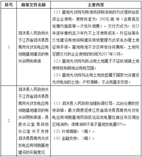 本基地嚴格按照國家能源局54號、76號、88號等文件要求和泗洪縣申報承諾進行競爭優(yōu)選工作,本基地建設(shè)提供的主要政策如下: