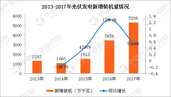據(jù)統(tǒng)計,2014-2015年我國光伏發(fā)電新增裝機量逐年穩(wěn)步上漲,特別是2016年我國光伏發(fā)電新增裝機容量3454萬千瓦,同比增長高達128.3%。初步計算,2017年光伏發(fā)電的新增裝機還是2016年的1.5倍、2015年的3.5倍、2014年的5陪和2013年的4倍,由此可見2017年光伏新增裝機出現(xiàn)了大幅快速增長。