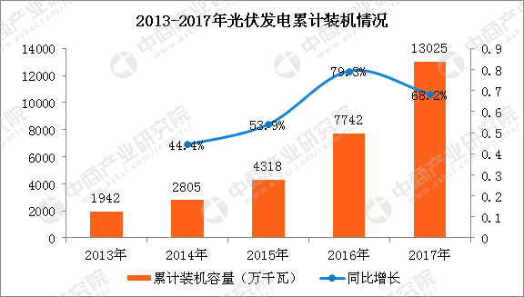 到2017年12月底,全國光伏發(fā)電裝機達到1.3億千瓦,其中,光伏電站10059萬千瓦,分布式光伏2966萬千瓦。而此前太陽能“十三五”規(guī)劃的目標僅105GW,已經提前并超額完成了“十三五規(guī)劃目標”。“十三五”以來,隨著太陽電池技術進步的快速提高,太陽電池生產成本和光伏發(fā)電成本快速下降,在各項光伏政策的支持下,我國光伏發(fā)電市場繼續(xù)保持快速發(fā)展。