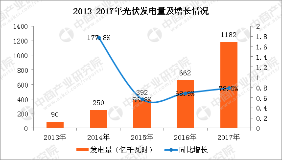 從發(fā)電情況來看:2017年,全國光伏發(fā)電量1182億千瓦時,同比增長78.6%,光伏發(fā)電量占全部發(fā)電量的比重由2016年的1.1%提高到1.8%。