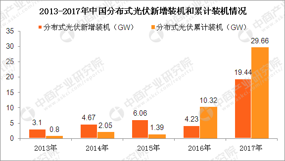 受上網(wǎng)電價調整等多重因素影響,2017年光伏發(fā)電市場規(guī)??焖贁U大,新增裝機5306萬千瓦,其中,光伏電站3362萬千瓦,同比增加11%;分布式光伏1944萬千瓦,同比增長3.7倍。2017年我不哦分布式光伏累計裝機2966萬千瓦,其中,分布式光伏新增裝機1944萬千瓦。