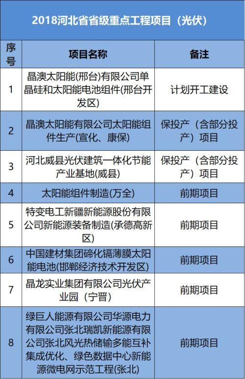 在河北省發(fā)改委發(fā)布的《2018年河北省重點項目公示》中,具體規(guī)模沒有披露,其中涉及光伏的重點項目共有8個,晶澳、特變、晶龍等企業(yè)都有規(guī)劃。