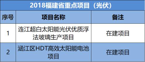 2018年度福建省重點項目1562個,總投資3.6萬億元。其中,在建項目1150個,總投資2.8萬億元、年度計劃投資4308億元;預備項目412個,總投資8540億元;涉及重點能源項目58個,連江超白太陽能光伏優(yōu)質(zhì)浮法玻璃生產(chǎn)項目、涵江區(qū)HDT高效太陽能電池項目為重點在建的光伏項目。