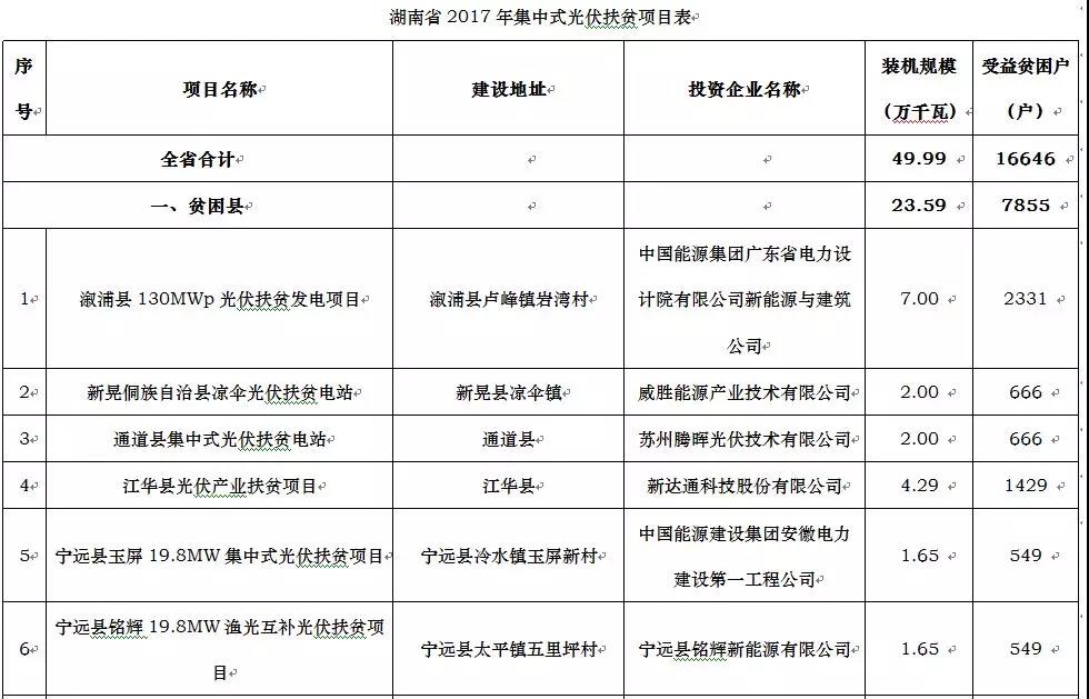 中國儲能網(wǎng)訊:根據(jù)《國家能源局關于可再生能源發(fā)展“十三五”規(guī)劃實施的指導意見》(國能發(fā)新能[2017]31號)和《國家能源局、國務院扶貧辦關于“十三五”光伏扶貧計劃編制有關事項的通知》(國能發(fā)新能[2017]39號)精神,省發(fā)改委、省扶貧辦、省財政廳聯(lián)合下發(fā)了《關于開展2017年集中式光伏扶貧項目申報工作的通知》(湘發(fā)改能源〔2017〕1133號),組織市州按照申報條件和篩選原則優(yōu)選投資企業(yè)和項目上報。