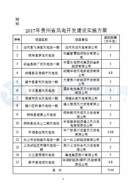 一、納入2017年貴州省風電開發(fā)建設(shè)實施方案的項目共15個,總裝機規(guī)模70.68萬千瓦。列入開發(fā)建設(shè)實施方案項目須在2017年內(nèi)完成核準工作,無法按時核準的項目作廢。