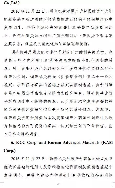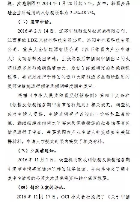 2016年2月14日,江蘇中能硅業(yè)科技發(fā)展有限公司、江西賽維LDK光伏硅科技有限公司、洛陽中硅高科技有限公司、重慶大全新能源有限公司(以下稱國內(nèi)產(chǎn)業(yè)申請人)向商務(wù)部提出正式申請,主張終裁后韓國向中國出口的太陽能級多晶硅傾銷幅度加大,超過了終裁確定的反傾銷稅稅率,要求對原產(chǎn)于韓國的進口太陽能級多晶硅所適用的反傾銷措施進行傾銷及傾銷幅度期中復(fù)審。