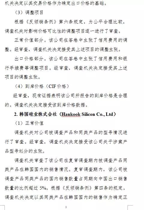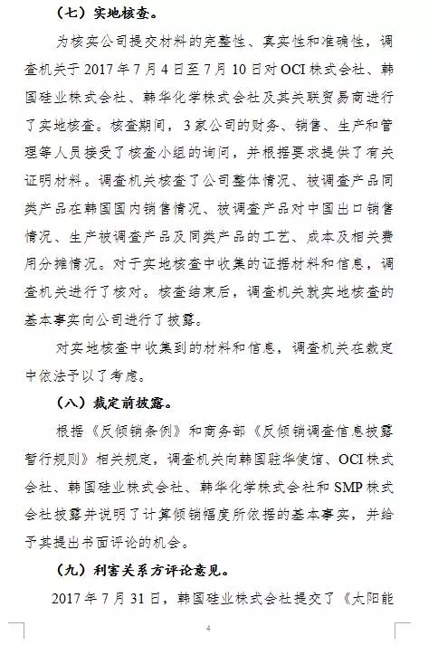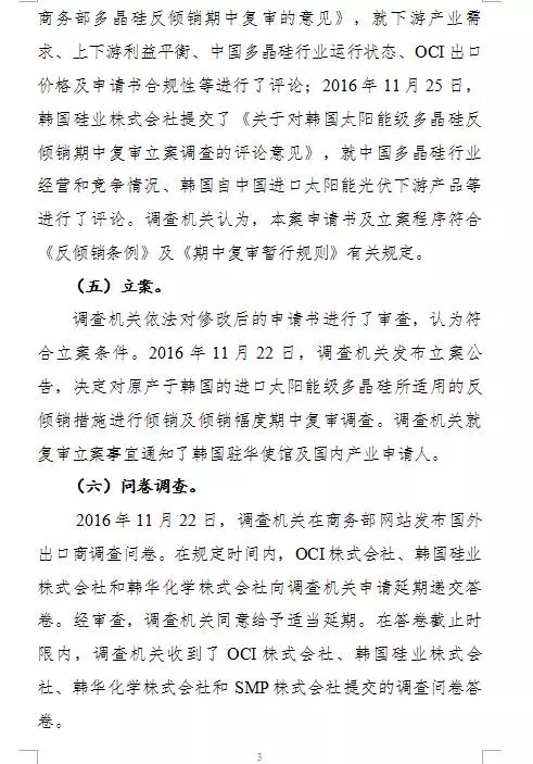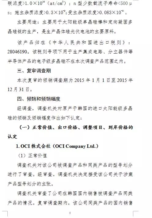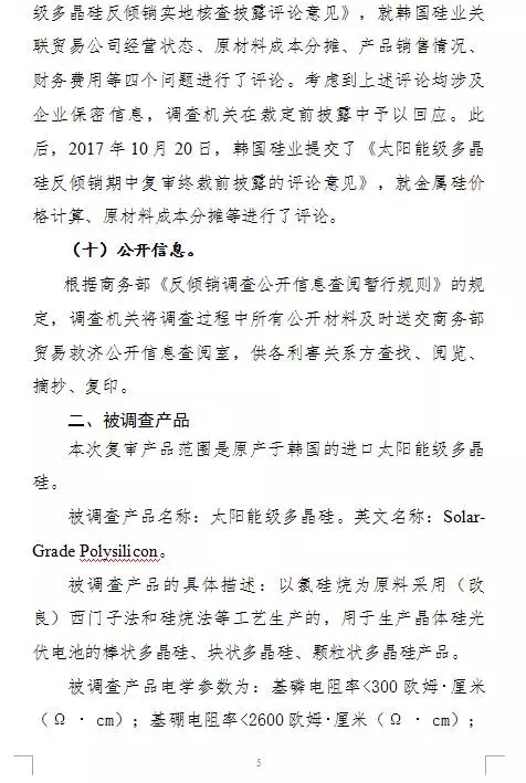 2016年11月22日,商務(wù)部發(fā)布立案公告,決定對原產(chǎn)于韓國的進口太陽能級多晶硅(以下稱被調(diào)查產(chǎn)品)所適用的反傾銷措施進行傾銷及傾銷幅度期中復(fù)審調(diào)查。本次復(fù)審調(diào)查范圍是原產(chǎn)于韓國的進口太陽能級多晶硅的正常價值、出口價格和傾銷幅度。復(fù)審調(diào)查的被調(diào)查產(chǎn)品與原反傾銷措施的被調(diào)查產(chǎn)品相同,即太陽能級多晶硅。該產(chǎn)品歸在《中華人民共和國進出口稅則》:28046190。該稅則號項下用于生產(chǎn)集成電路、分立器件等半導(dǎo)體產(chǎn)品的電子級多晶硅不在本次復(fù)審調(diào)查產(chǎn)品范圍之內(nèi)。