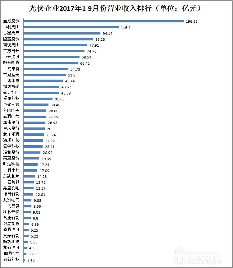 一、光伏企業(yè)2017年前三季度營業(yè)收入及增幅排行榜