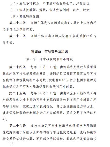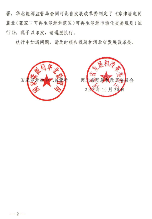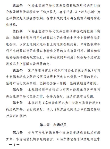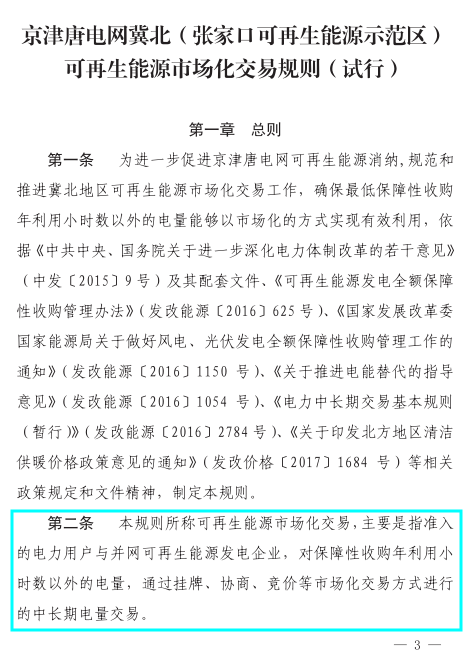 中國儲(chǔ)能網(wǎng)訊:華北能源監(jiān)管局、河北省發(fā)改委日前聯(lián)合印發(fā)了《京津唐電網(wǎng)冀北(張家口可再生能源示范區(qū))可再生能源市場化交易規(guī)則(試行)》特急文件。規(guī)則中所稱可再生能源市場化交易,主要是指準(zhǔn)入的電力用戶與并網(wǎng)可再生能源發(fā)電企業(yè),對保障性收購年利用小時(shí)數(shù)以外的電量,通過掛牌、協(xié)商、競價(jià)等市場化交易方式進(jìn)行的中長期電量交易。