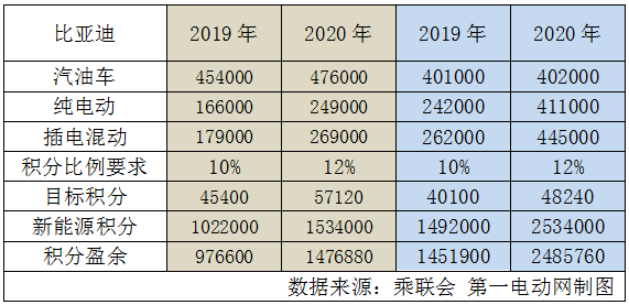 2016年初,比亞迪總裁王傳福在接受媒體采訪(fǎng)時(shí)表示,未來(lái)三年新能源車(chē)銷(xiāo)量要每年翻倍增長(zhǎng)。根據(jù)乘聯(lián)會(huì)數(shù)據(jù),比亞迪新能源乘用車(chē)2015年58869輛、2016年100178輛銷(xiāo)量來(lái)看,增速在70%左右。而燃油車(chē)則是從2015年393619輛增至2016年的394183,僅微增0.14%。以此推算,2019-2020年比亞迪將產(chǎn)生大量新能源正積分。