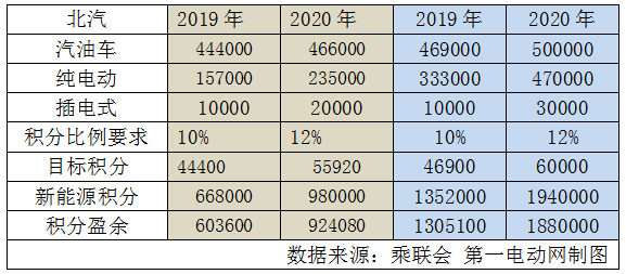 北汽集團(tuán)規(guī)劃指出,到2020年自主品牌銷(xiāo)量超過(guò)100萬(wàn)輛,其中新能源車(chē)目標(biāo)50萬(wàn)輛。如果按照從2016年到2020年每年以一定增速穩(wěn)步遞進(jìn),那么2019-2020年北汽將產(chǎn)生大量新能源正積分。