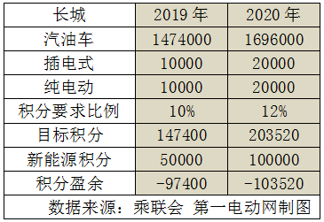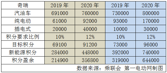 根據(jù)奇瑞規(guī)劃,2020年沖擊100萬(wàn)銷(xiāo)量,其中新能源車(chē)20萬(wàn)。如果按照從2016年到2020年每年以一定增速穩(wěn)步遞進(jìn),那么2019-2020年奇瑞將產(chǎn)生大量新能源正積分。