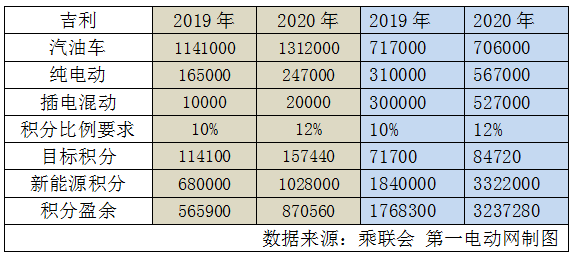按照“藍(lán)色吉利行動(dòng)”,吉利2020年目標(biāo)銷(xiāo)售200萬(wàn)車(chē),包括20萬(wàn)左右商用車(chē)。其中90%的汽車(chē)都是新能源汽車(chē),其中插電式混動(dòng)與油電混動(dòng)汽車(chē)銷(xiāo)量占比達(dá)到65%,純電動(dòng)汽車(chē)銷(xiāo)量占比達(dá)35%,值得注意的是,吉利將約32.5%油電混動(dòng)作為新能源處理,但按照政策它不屬于新能源。這意味著2020年,吉利要銷(xiāo)售109.4萬(wàn)新能源乘用車(chē)。如果按照從2016年到2020年每年以一定增速穩(wěn)步遞進(jìn),那么2019-2020年吉利將產(chǎn)生大量新能源正積分。