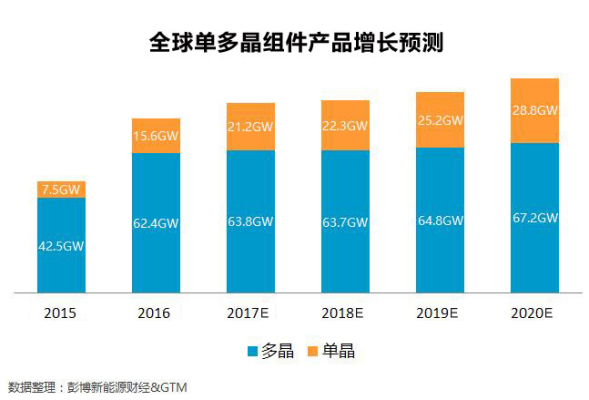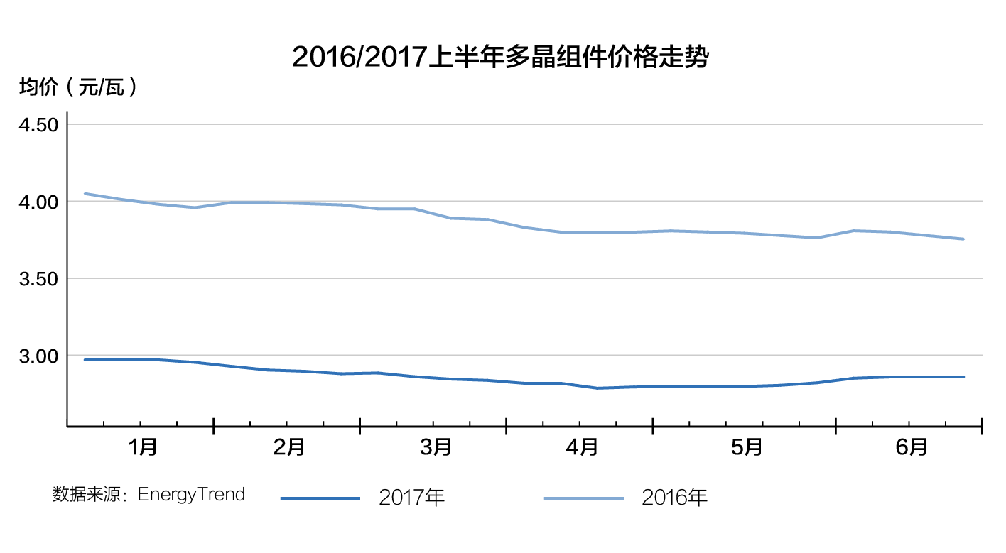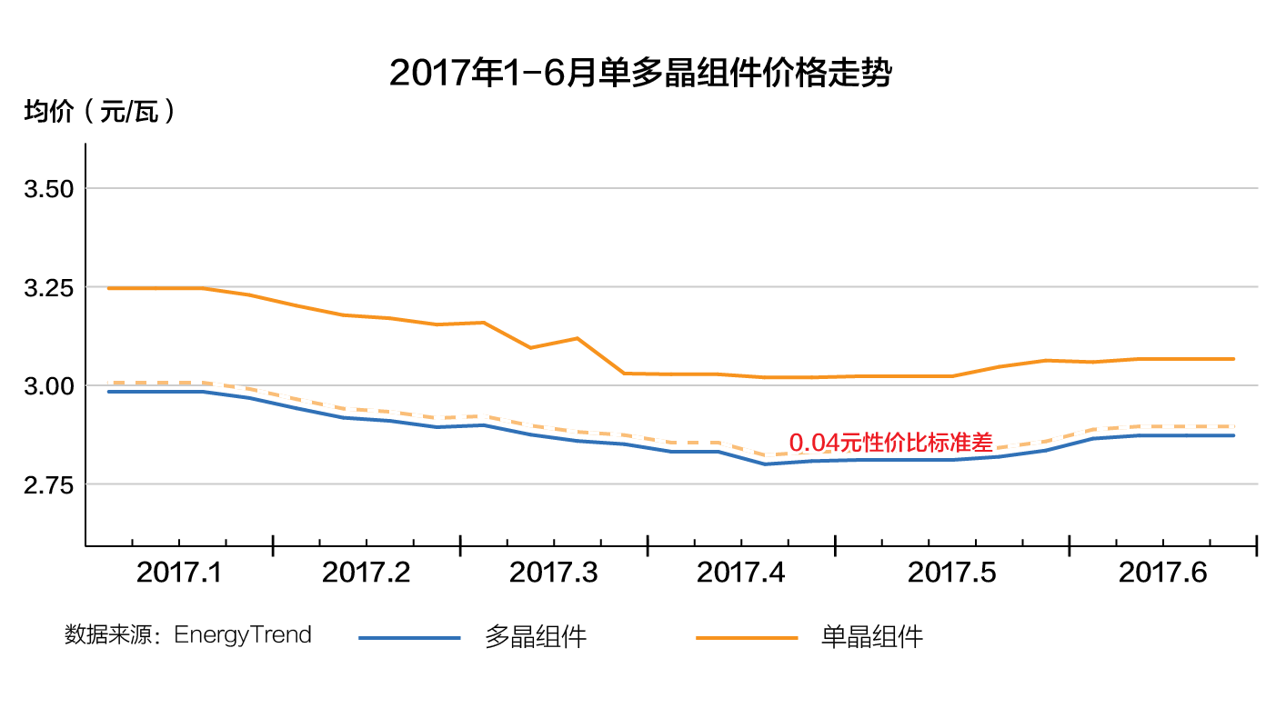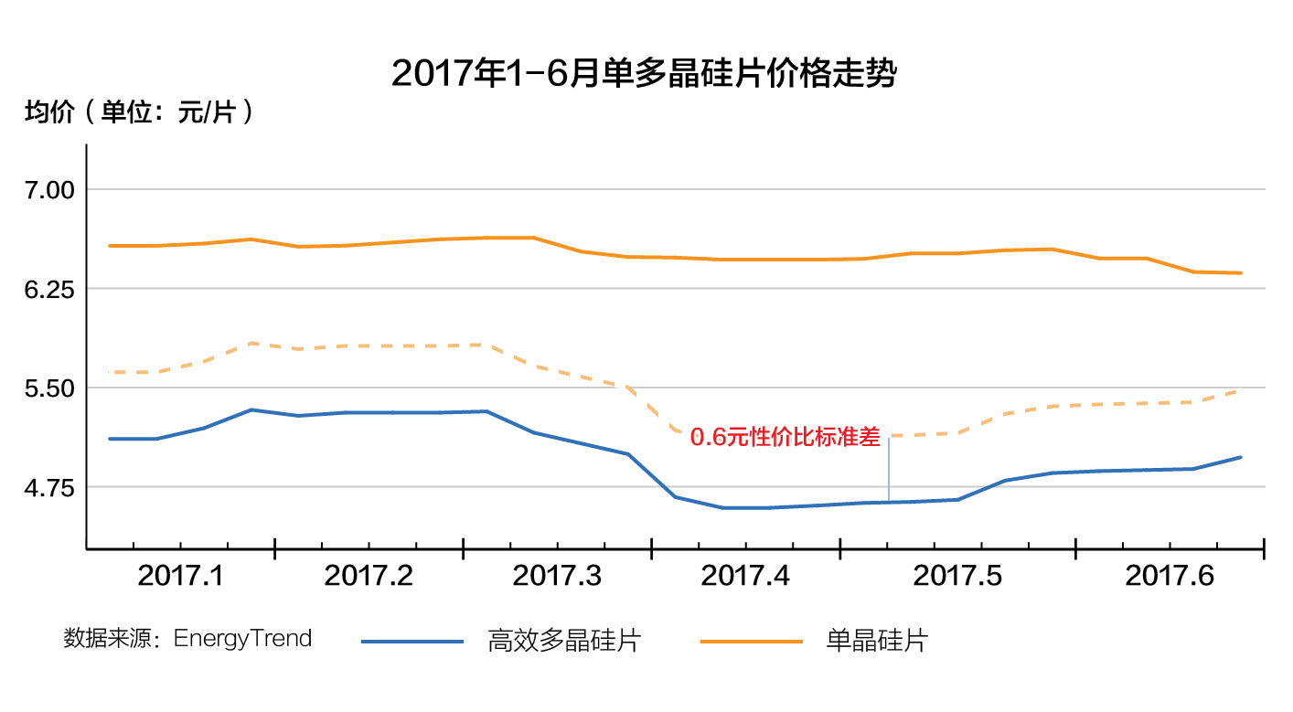 集邦新能源統(tǒng)計(jì)數(shù)據(jù)顯示,2017上半年光伏市場(chǎng),從一季度的市場(chǎng)淡季到二季度的6.30搶裝,多晶硅片價(jià)格在4.5-5.3元/片之間,單晶硅片價(jià)格在6.3-6.5元/片之間,單晶幅度變動(dòng)不大,一直處于高位。組件價(jià)格3元成為單多晶分水嶺,單晶組件價(jià)格3.1-3.2元/瓦,和多晶有0.2-0.3元/瓦的價(jià)差,而且產(chǎn)能不足一片難求,造成了包括“領(lǐng)跑者”項(xiàng)目在內(nèi)的眾多設(shè)計(jì)成單晶電站無法按期完工,錯(cuò)失了6.30并網(wǎng)節(jié)點(diǎn)。