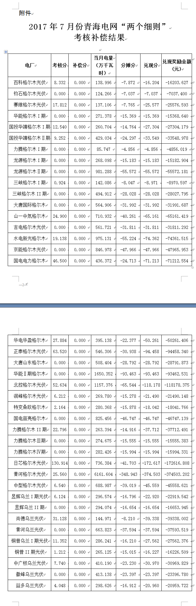中國儲能網(wǎng)訊:根據(jù)《關(guān)于印發(fā)<西北區(qū)域發(fā)電廠并網(wǎng)運行管理實施細(xì)則>及<西北區(qū)域并網(wǎng)發(fā)電廠輔助服務(wù)管理實施細(xì)則>的通知》(西北監(jiān)能市場〔2015〕28號)規(guī)定,2017年7月份青海電網(wǎng)發(fā)電廠并網(wǎng)考核和輔助服務(wù)補償結(jié)果復(fù)核工作已完成,現(xiàn)予公布,請依據(jù)附件結(jié)算。