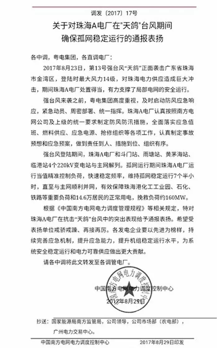 中國儲能網(wǎng)訊:關于對珠海A電廠在“天鴿”臺風期間確保孤網(wǎng)穩(wěn)定運行的通報表揚