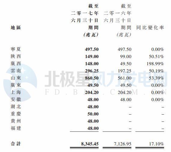 截至2017年6月30日止,大唐新能源控股裝機(jī)容量為8,497.92兆瓦,同比增長16.9%。其 中,風(fēng)電控股裝機(jī)為8,345兆瓦,同比增加17.1%,太陽能控股裝機(jī)147.47兆瓦,其他清潔能源控股裝機(jī)容量5兆瓦。發(fā)電量7,339,991兆瓦時(shí),同比升高16.55%;風(fēng)電平均利用小時(shí)數(shù)941小時(shí),同比升高20小時(shí);風(fēng)電限電率19.36%,同比下降5.8個(gè)百分點(diǎn)。平均上網(wǎng)電價(jià)(含稅)572.53元╱兆瓦時(shí),較2016年同期降低6.21元╱兆瓦時(shí)。